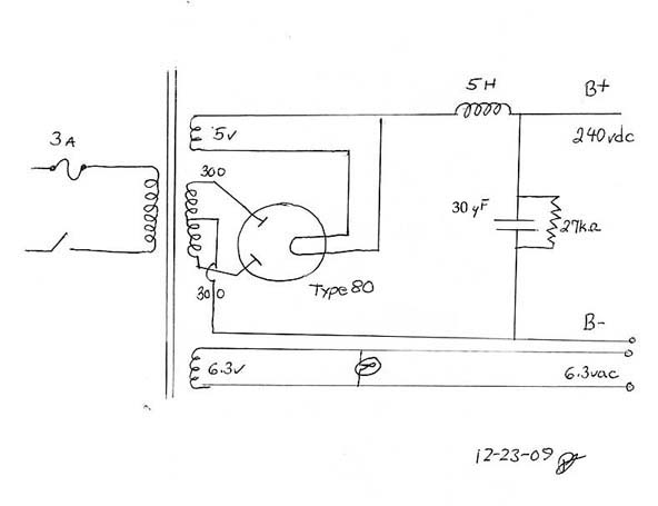 This project resulted in a supply with a measured output voltage of 248 volts at 75ma and an adequate filament supply.