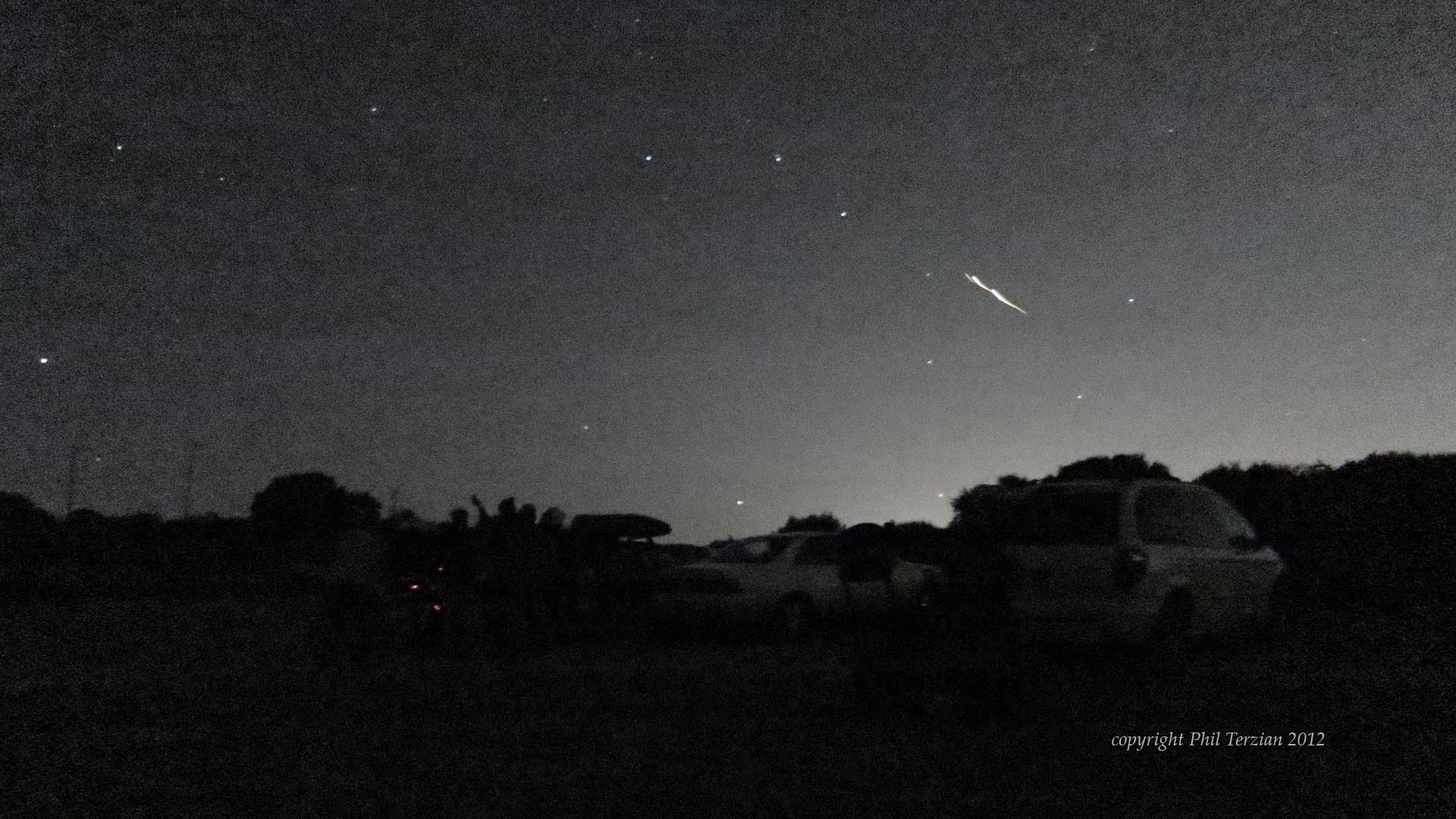 A meteor "fireball" breaks into three pieces as it traverses the cup of Ursa Major (the Big Dipper) on October 17, 2012 at 7:44 PM. Photographed from Montebello Preserve, Palo Alto, CA. Canon S-110, f/2.0, iso 12,800, 1 second exposure.
