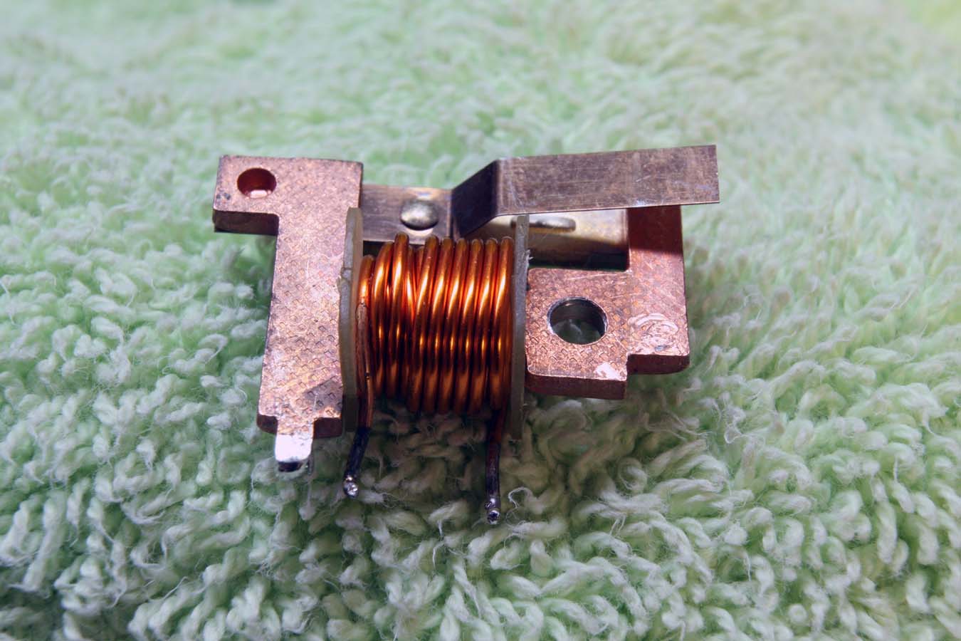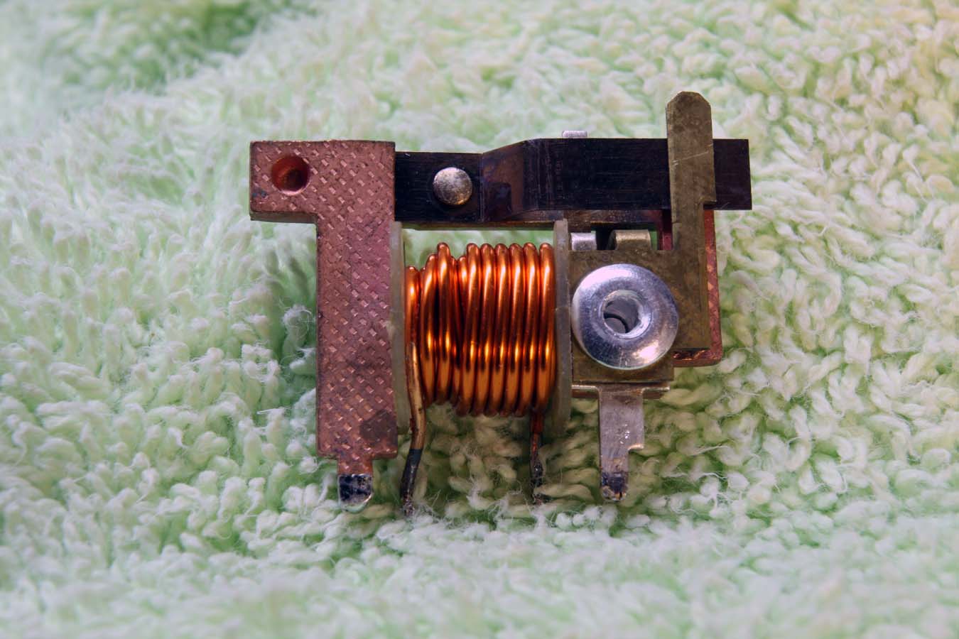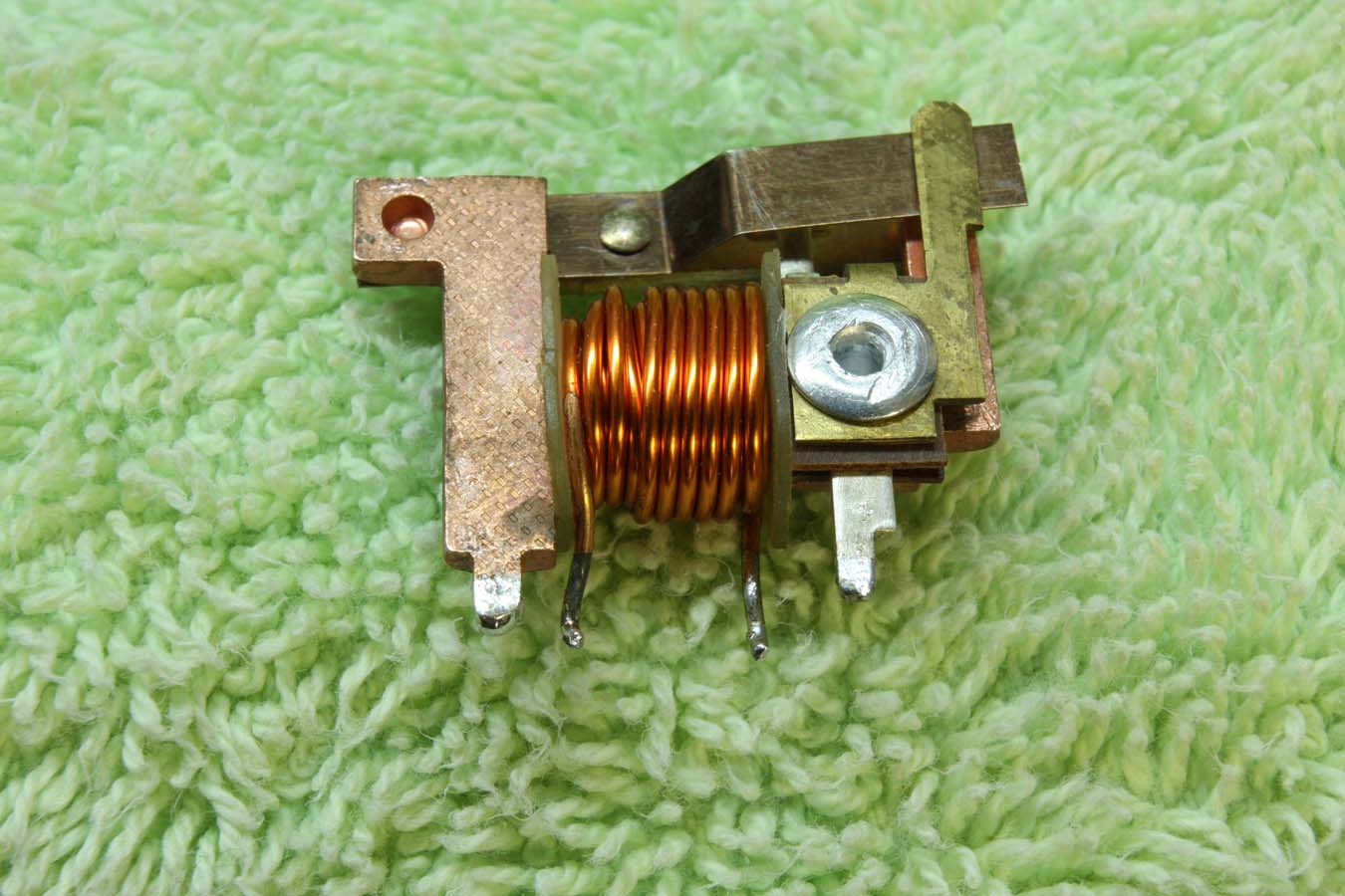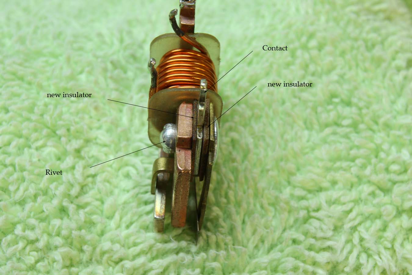 Note the rivet holding the contact and insulators together on the right side of the secondary relay. The original rivet is a hollow rivet, but is not a pop rivet (shown here).