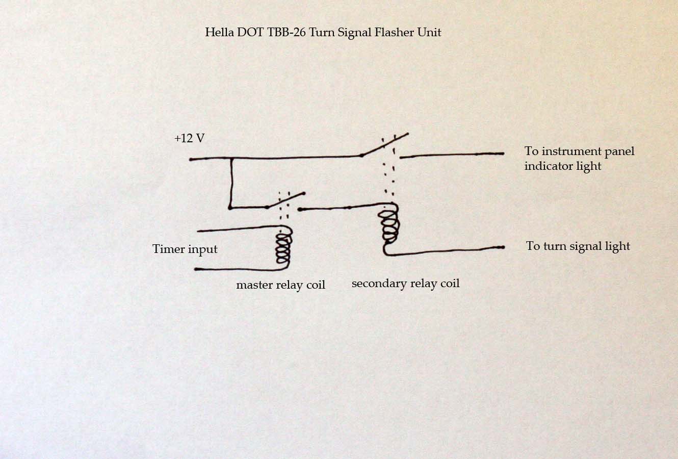 Here is a functional schematic of the flasher unit. When the turn signal is activated with the right hand side thumb switch the transistorized timer circuit in the flasher applies a pulsating signal to the master relay coil. This sends a current through the secondary relay coil as well as lighting up the signal lights on the motorcycle. The secondary relay contacts are connected to the turn signal indicator light on the instrument panel.