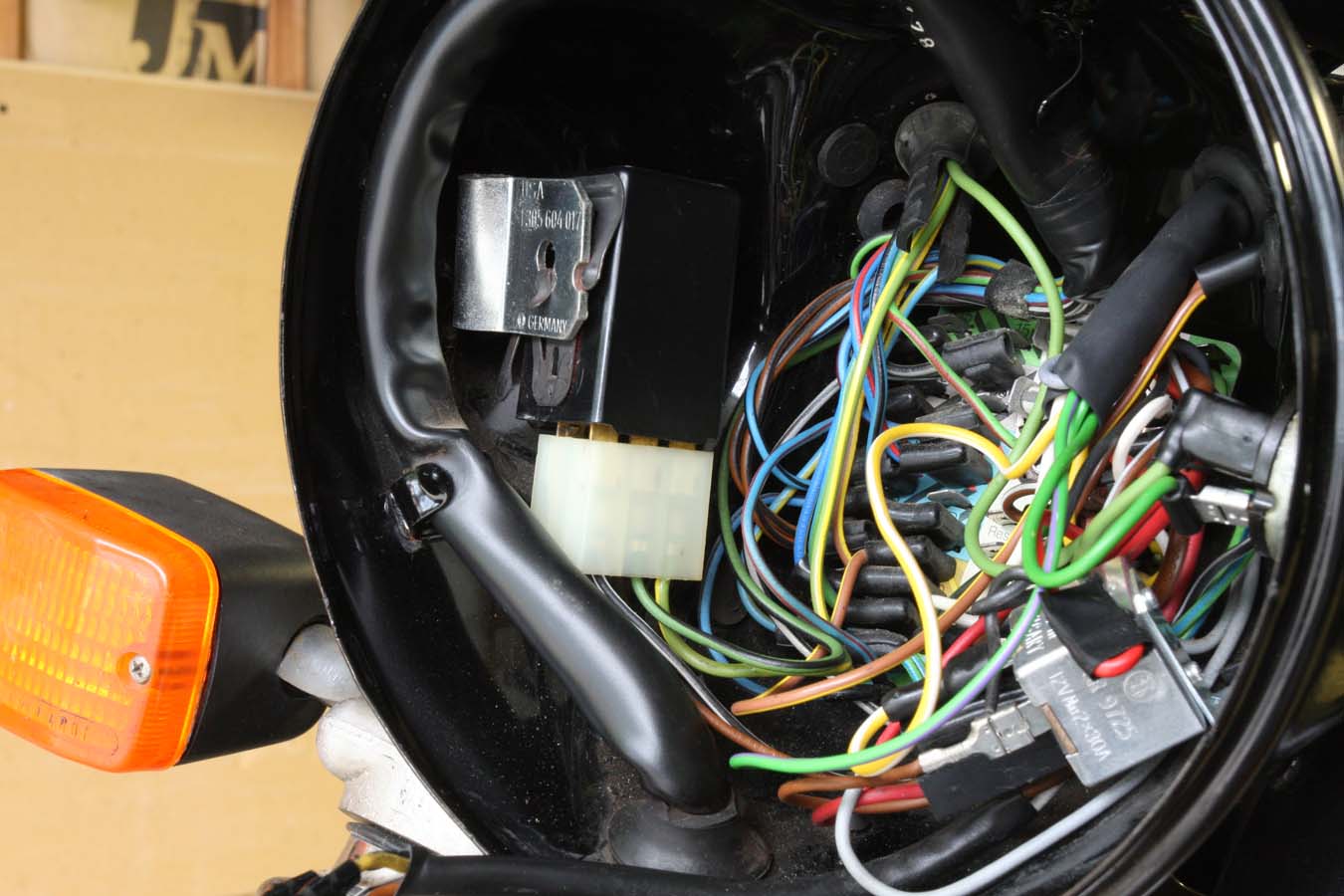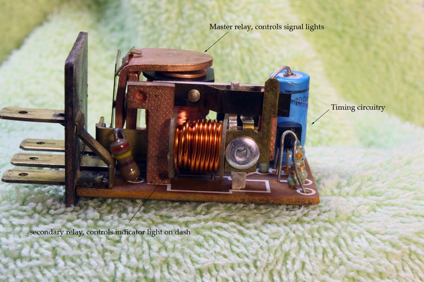 The flasher unit electronics slide out of the housing. There are two relays in the flasher unit. I call them the master and the secondary relays