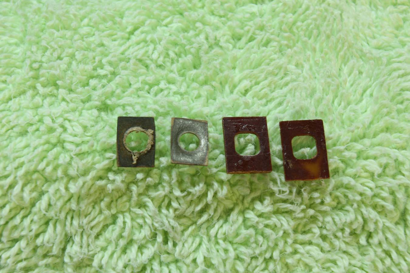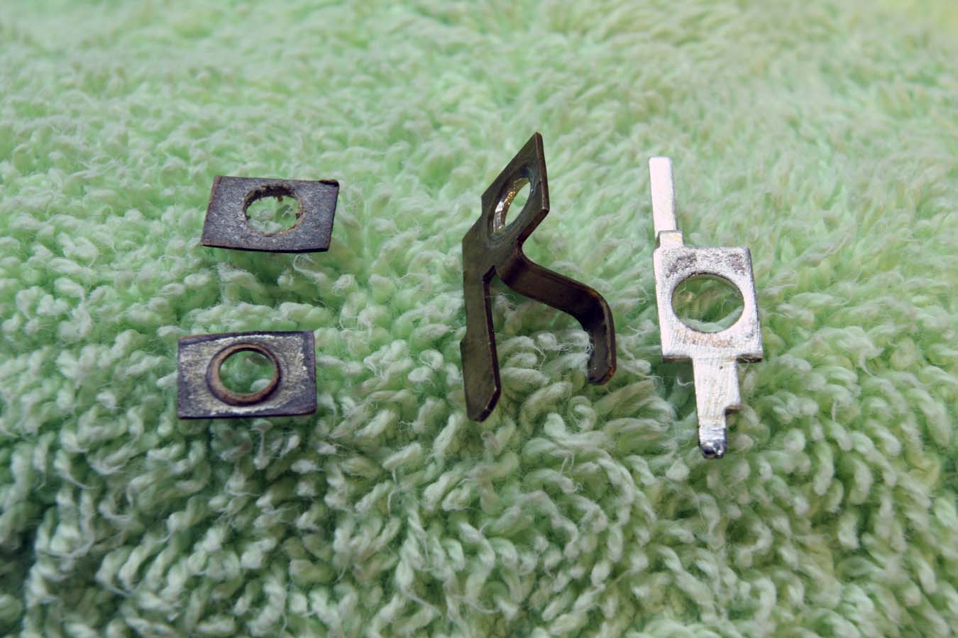 Here are the two insulators (on the left) a support piece, and a silver plated contact. Note how the insulators are pretty shabby looking. They are made from some sort of paper and must have absorbed some water over time because they are no longer good insulators. I was measuring 42 ohms across the contacts on this relay when the relay was open. It should be an infinite resistance in that state.