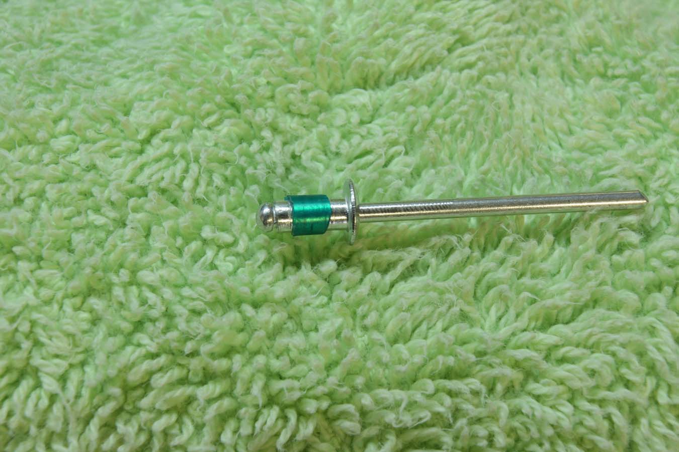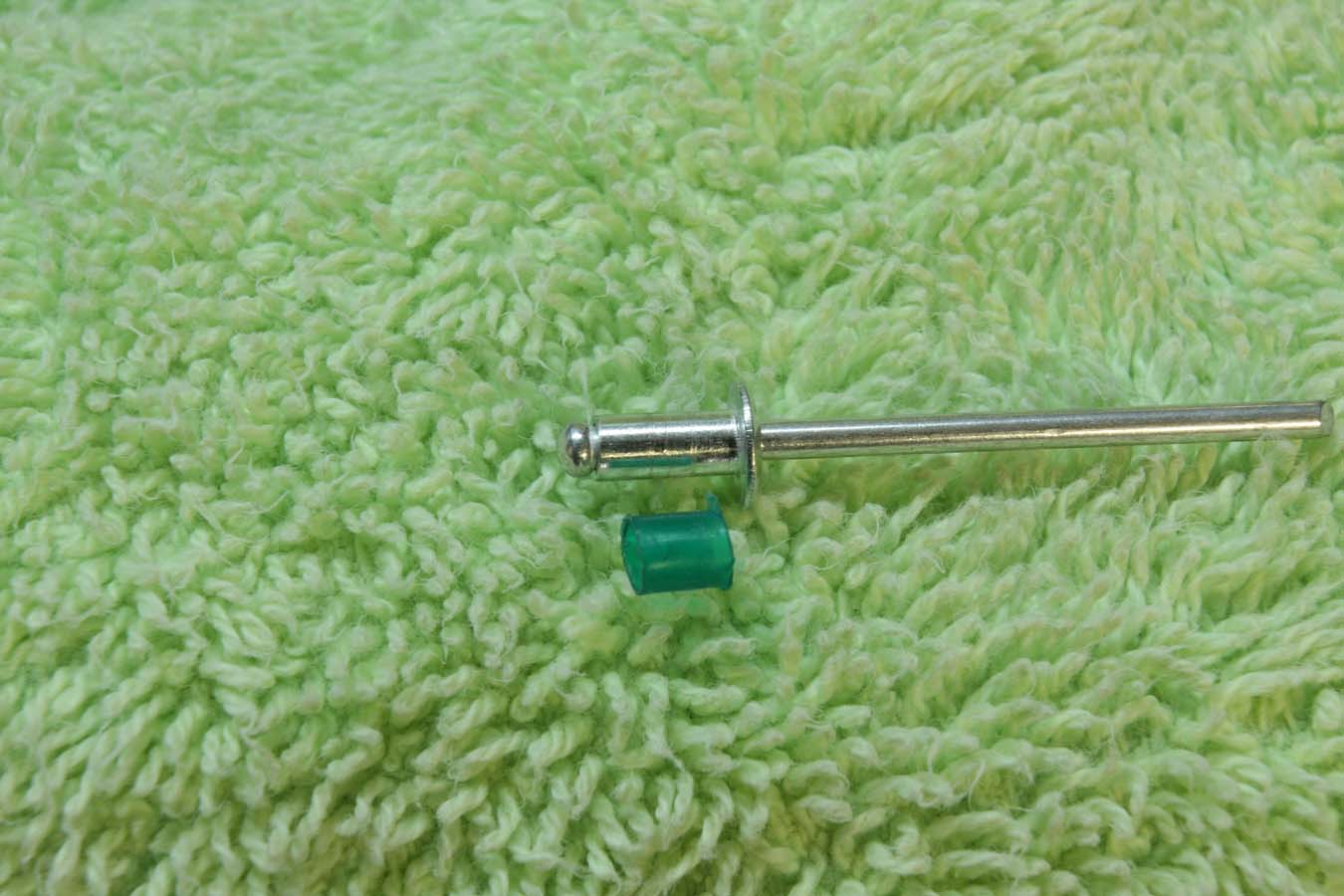 Here the rivet has been drilled out. This hole is 1/8" in diameter, so you will use a 1/8" rivet to eventually reassemble everything.