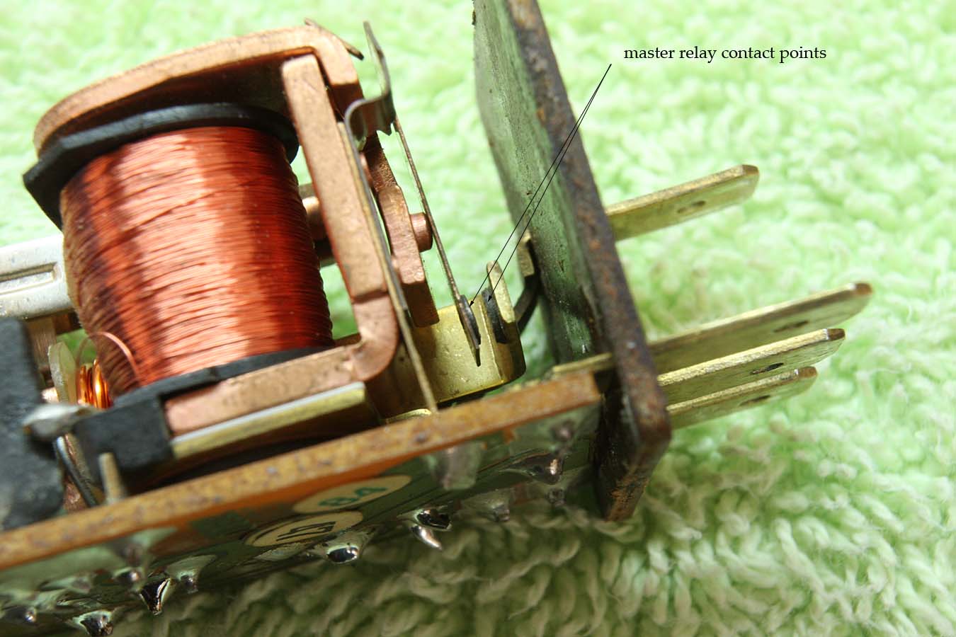 These are the master relay contacts. To polish them up for a low resistance connection just gently slide some 220 sandpaper through the gap while holding the contacts closed. Don't overdo it. This will probably solve the problem of the indicator light not working even though the turn signals themselves are working.
